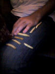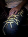 ルールは同じ姿勢のまま全く起きない主役の膝の上に気付かれずにどのくらいポテトを乗せられるか。