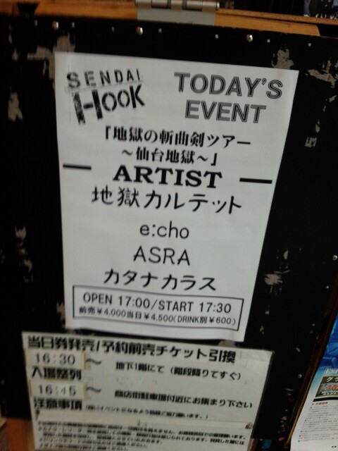 201408/09 地獄の斬曲剣ツアー ASRA 0 今日は仙台Hookで地獄カルテットさんのオープニングアクトでした。地獄の皆さんは勿論、対バンのe:cho、カタナカラス、Hookスタッフの皆さん、MI関係者、皆様有り難うございます!!ライブは普段から欠かせない竜巻地獄ことRudra's Hellも勿論演奏。時間は短めでしたがASRAの世界観は十分に伝えられたと思います。で、打ち上げもご一緒させていただき凄く貴重なお話も聞かせていただきました!明日はこのまま地獄さんのバンドセミナーです!!チャラヘッチャラ!! [2回]