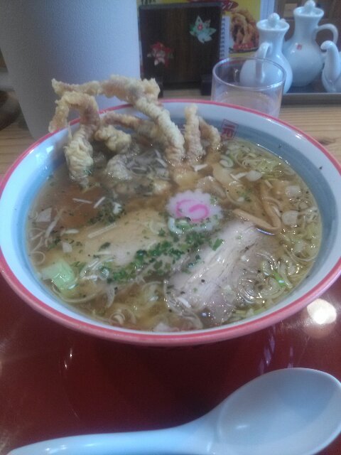 201205/03 ゲソでゲソ 拉麺 0 有頂天の元祖 中田店のゲソ天ラーメン。 醤油にしたんだけど、やっぱり味噌にしとけば良かったかなーとか思ってたら、醤油に辛味噌トッピングも人気らしく、後から辛味噌もご注文。 うん、引き締まりました。 メインのゲソ天もサクサクで良い感じだけど、早く食べないとぐずぐずになるので注意。 どん兵衛の天ぷらみたいな(笑) まあ、その方が好きな人はおもいっきり汁吸わせてもいいと思います。 [0回]
