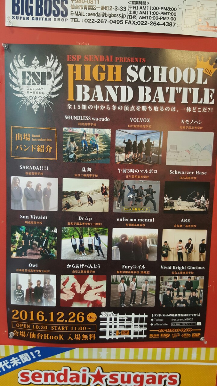 201612/26 MI納め 日常 0 今日はMI年内ラストの大仕事、ハイスクールバンドバトルでした。かれこれもう第6回。毎回、レベルアップは勿論、オリジナルで挑むバンドも増えて来てまして、メロディーからアレンジまで本当に高校生かよ!といったバンドも珍しくなくなってきました。技術+センスまであるとは若い力は凄まじいです。さて、後はKOKのターン。 [1回]
