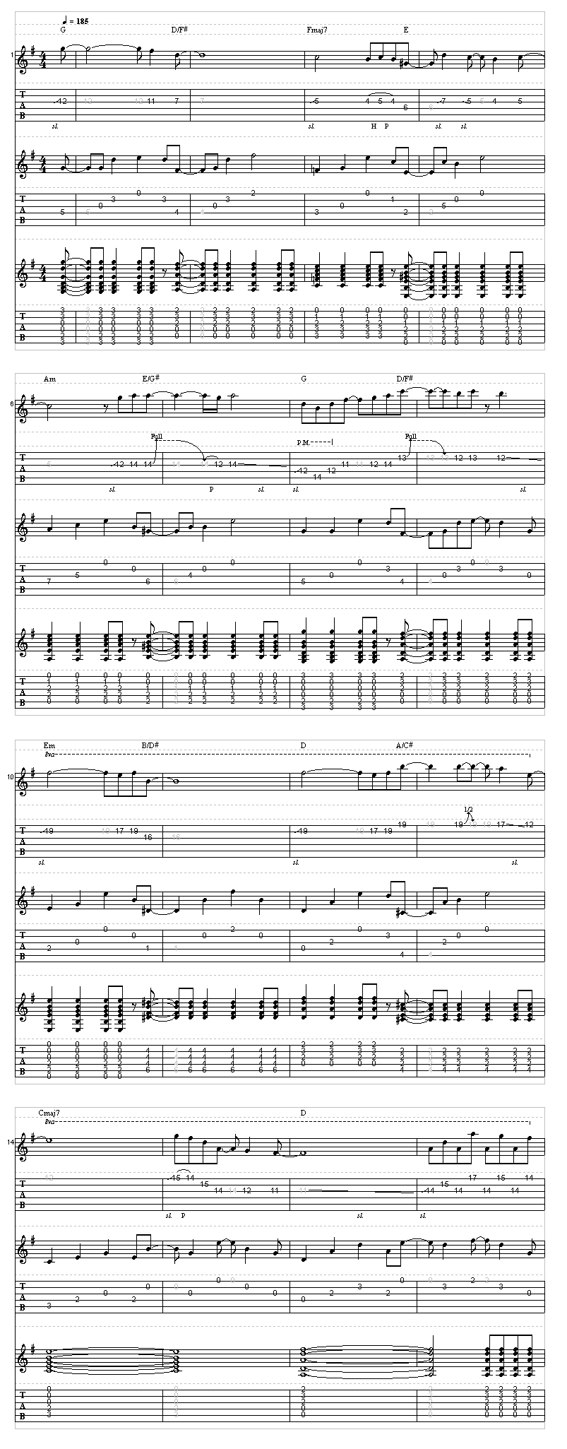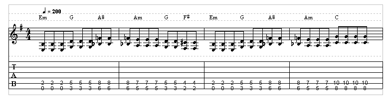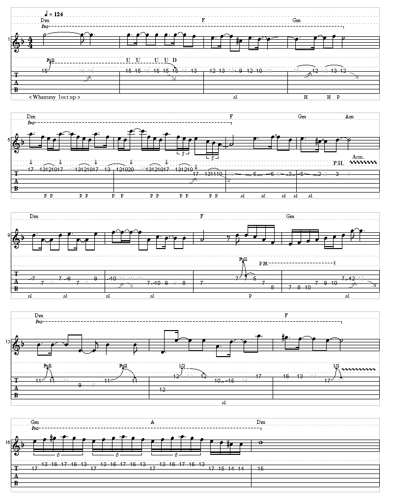 これは、クランチのコードストロークとクリーンのアルペジオのバッキングに優雅なソロが乗るギター三本のアンサンブルですが、クリシェといわれる半音進行で流れるような構成になっている所がポイントです。