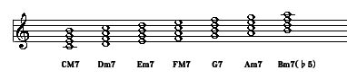 且つ、どのキーにおいても通用出来るようにⅠM7、Ⅱm7、Ⅲm7、ⅣM7、Ⅴ7、Ⅵm7、Ⅶm7♭5と一般的には呼ばれています。