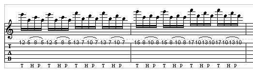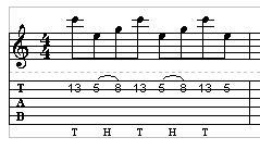 タッピングとは右手の指でハンマリングからプリングを連続して行う技で、この場合左手は5~8フレットの位置のまま、右手で13フレットをタッピングし、そのプリングで5フレットを鳴らし、8フレットにハンマリング。という三音ひとくくりのパターンです。