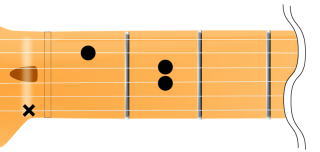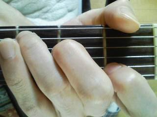 また、×がついている6弦は鳴らさないという意味なので今度は逆に親指で軽く触れておきます(写真参照)。