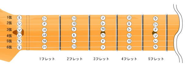 ピアノでもわかるようにミの隣には黒鍵がない。つまりミとファの間は半音しか違わないことになるのでギターではすぐ隣のフレットになる。