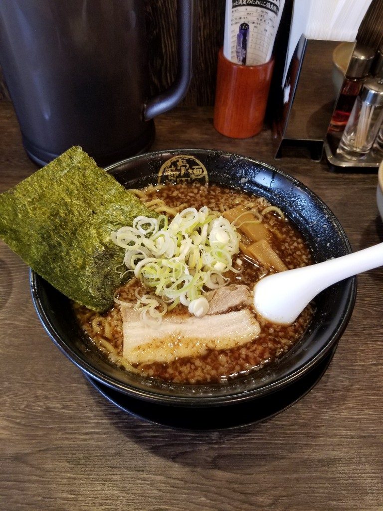 かなり節の効いた濃いめのスープにシコシコの中太麺でした。