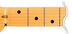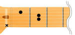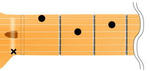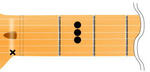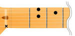 これは6弦に×が付いているので、セーハした人差し指の先で軽く6弦に触れてミュートする。(セーハするコードは基本的に親指がネックの裏に来るので、前回のCの様に親指でミュートする事ができない為。)