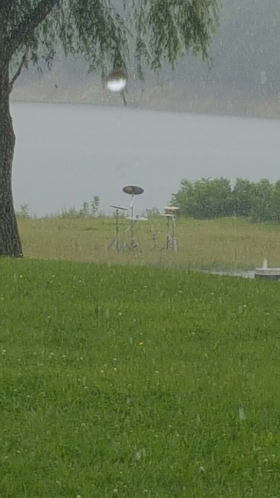 突然雨が降ってきたので急いで屋根の下に避難したんだけど、取り残されたシンバル達。