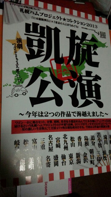 201310/29 お芝居 日常 0 今年も札幌ハムプロジェクトさん見て来ました。今回の演目は「パレパーレ星の新しい生き物」やっぱり面白い。とにかく凄いんだよ。これは生で見なきゃわかんない。パワーがある。そしてパワーを貰える。一年に二回くらいは見たいなあ。 [1回]
